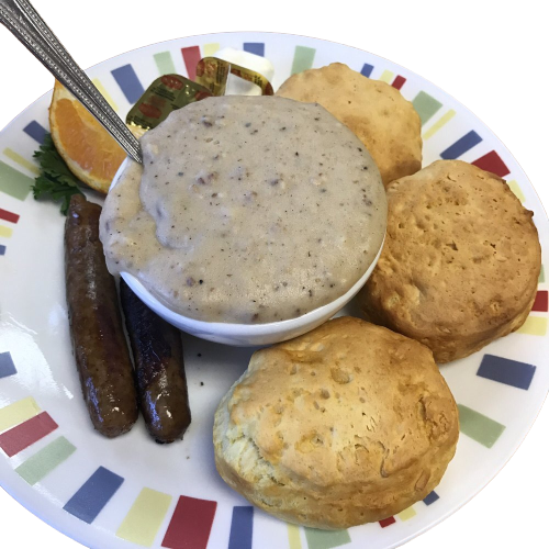 Our "Okie" Country Gravy with choice of Bacon or Sausage and Fresh Baked Biscuits. Add potatoes or any of our Specialty Sausages