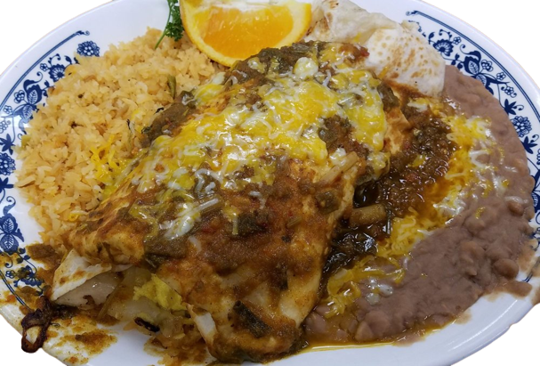 An extra Large Flour Tortilla filled with Melted Cheese, Three Scrambled Eggs, Potatoes, and Choice of Chorizo, Bacon, Sausage or Turkey. Topped with Spicy Ranchero Sauce and Cheese. Served with Refried Beans and Rice
