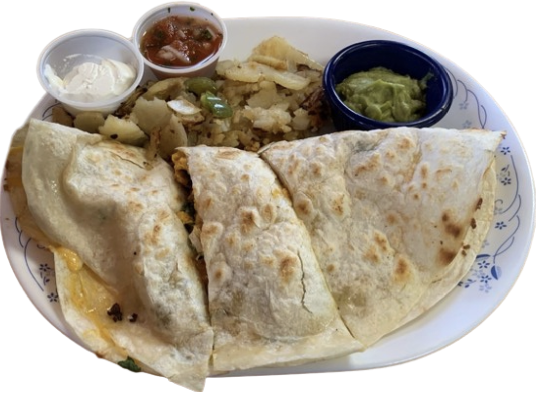 An Extra Large Flour Tortilla filled with Three Scrambeled Eggs, Scallions, Cilantro, Jack and Cheddar Cheese and Your Choice of Bacon, Sausage, or Chorizo. Avocado, Salsa and Sour Cream on the side. Served with Potatoes