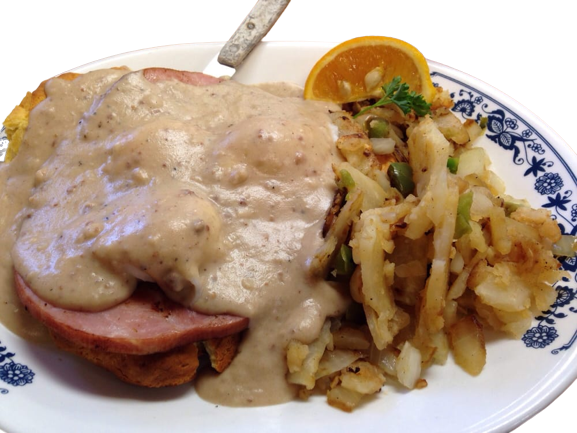 Three Fresh Baked Biscuits, Three Poached Eggs and Ham. Smothered with Country Gravy. Served with Potatoes