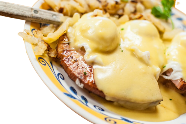 Three Poached Eggs atop a Grilled English Muffin, Ham and a Creamy Hollandaise Sauce. Served with Potatoes