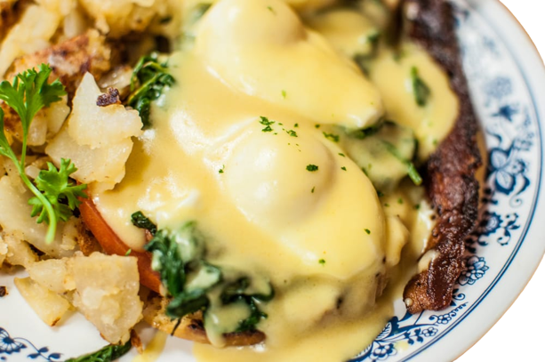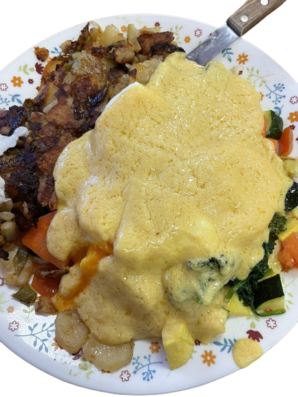Sauteed Spinach, Steamed Vegetables, Tomato Slices, Avocado and Three Poached Eggs on an English Muffic Topped with Hollandaise Sauce. Served with Potatoes