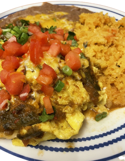 Three Eggs any style atop Corn Tortillas covered with Spicy Ranchero Sauce, Diced Tomatoes, Scallions, Cilantro and Cheese. Served with Rice and Beans