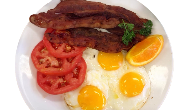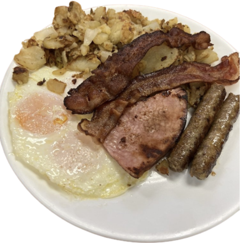 Three Eggs any style, Turkey Bacon, Cure "81" Ham, and Sausage with Your Choice of Spinach, Tomatoes or Cottage Cheese